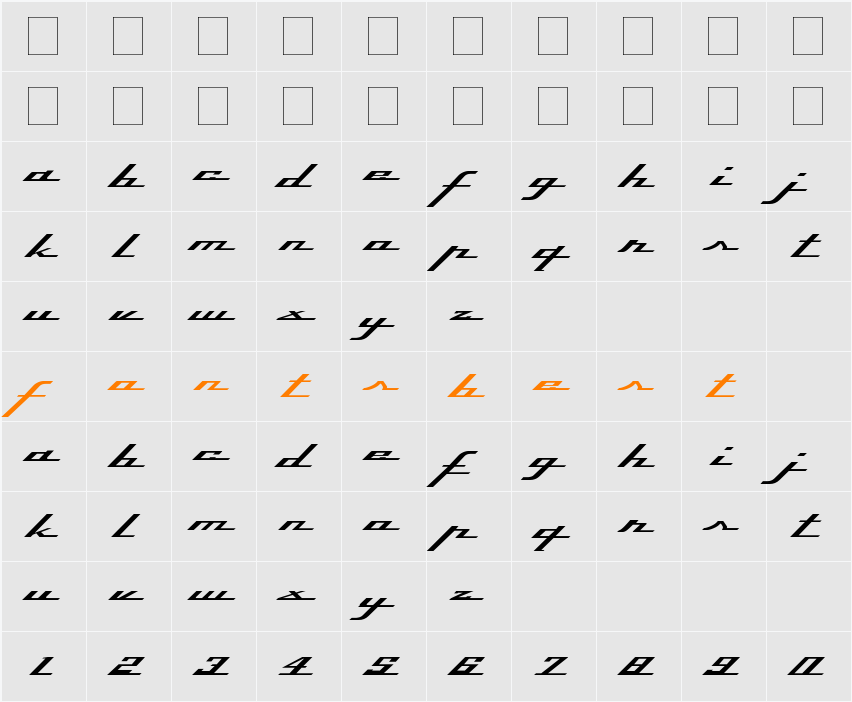 ___________________________________Top Speed is strictly a display typeface, and should be used for no more than one line–preferably only one or two words–at a time. The most distinctive feature of Top Speed is the fact that all the letterforms are connected to each other. To maintain this look, all the characters have tails. The forward-slash character (and underline character) can be inserted between words instead of using the space bar, maintaining the continuous baseline. The back-slash character is a somewhat shorter connector; the ‘|’ key is a slightly longer connector. To begin your word or line of text, you should insert a small version of the baseline, which is the “” character, as it will end your tail at the appropriate distance. These characters are more necessary in the Outline version of the font. Top Speed may require minor kerning adjustment with some characters. Because each letter must be placed EXACTLY next to the following letter, (Top Speed Normal and Heavy are slightly more forgiving) you might notice a sliver appear between an occasional pair of letters. There are no differences in the capital letters except for the letter F. The capital letter F does not continue along the baseline, but instead it can run into certain letters (typically, the a, o, or u) through it’s horizontal crossed stroke. The Outline version of the capital F contains an extra bit of black. This fills up the “hole” left at the beginning of the next character. If the capital F is used to end a word or sentence using Top Speed Outline, that little speck will have to somehow be creatively covered up.